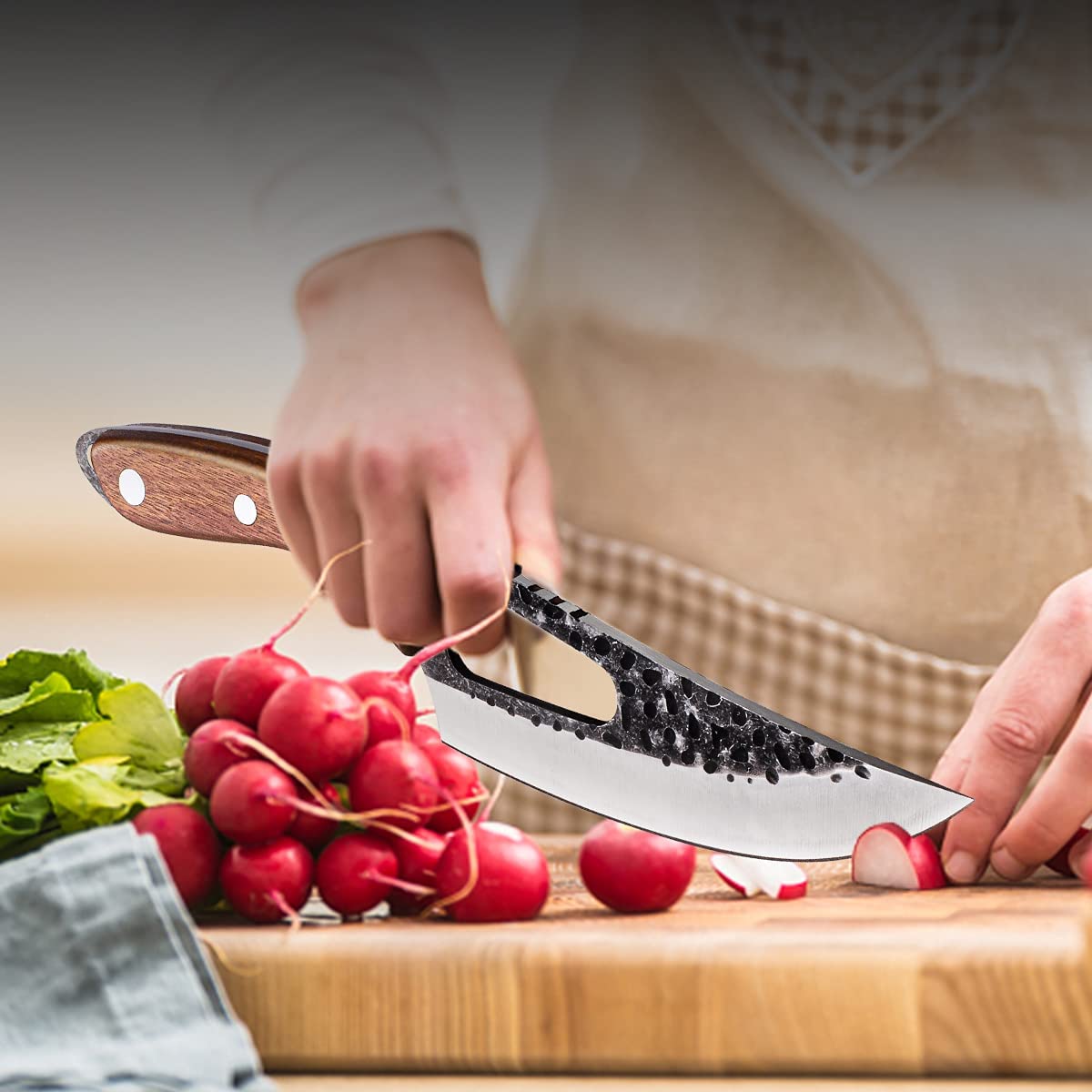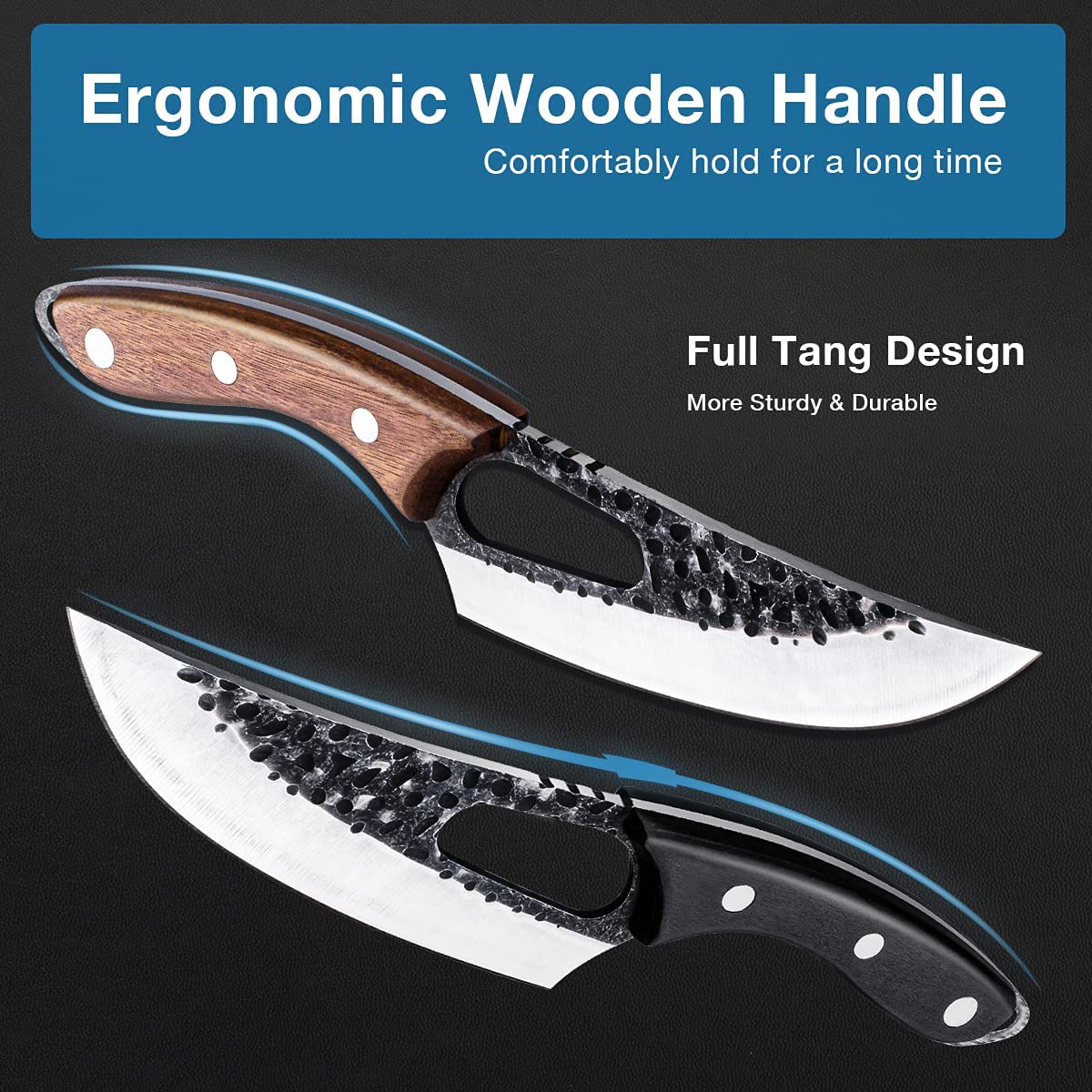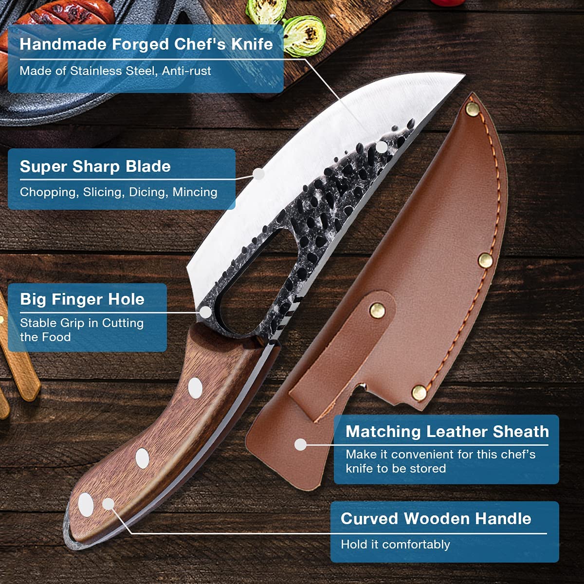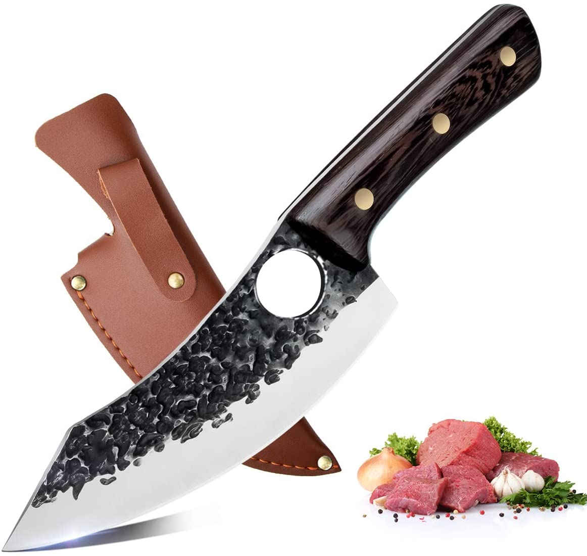 *[ERGONOMISCHER GRIFF]-Die Kochmesser handgeschmiedet mit gebogenem Holzgriff bietet ein perfektes Gleichgewicht zwischen Klinge und Griff und ist bequemer in der Hand. Das Loch für den finger bietet dem Küchenmesser eine sicherere Kontrolle.