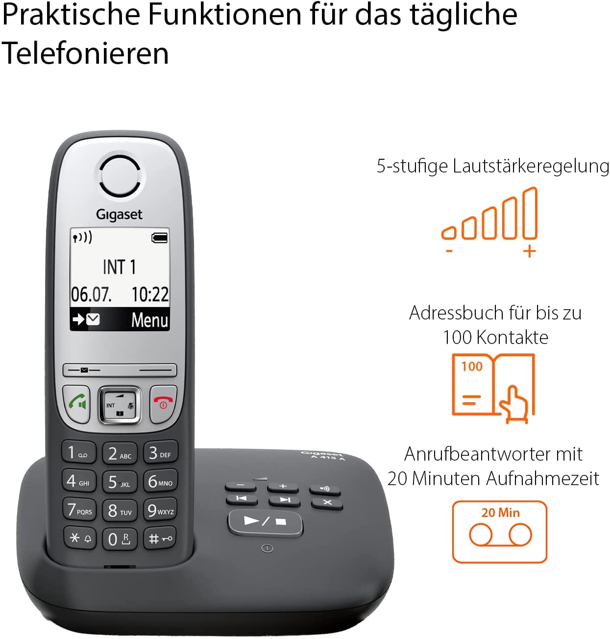 STARKE FUNKTIONEN 6 ANRUFBEANTWORTER: brillante Sound-Qualität auch mit der Freisprechfunktion – 5-stufige Lautstärkeregelung – Telefonbuch für 100 Kontakte – bei Anrufen oder Nachrichten blinkt die Anruftaste