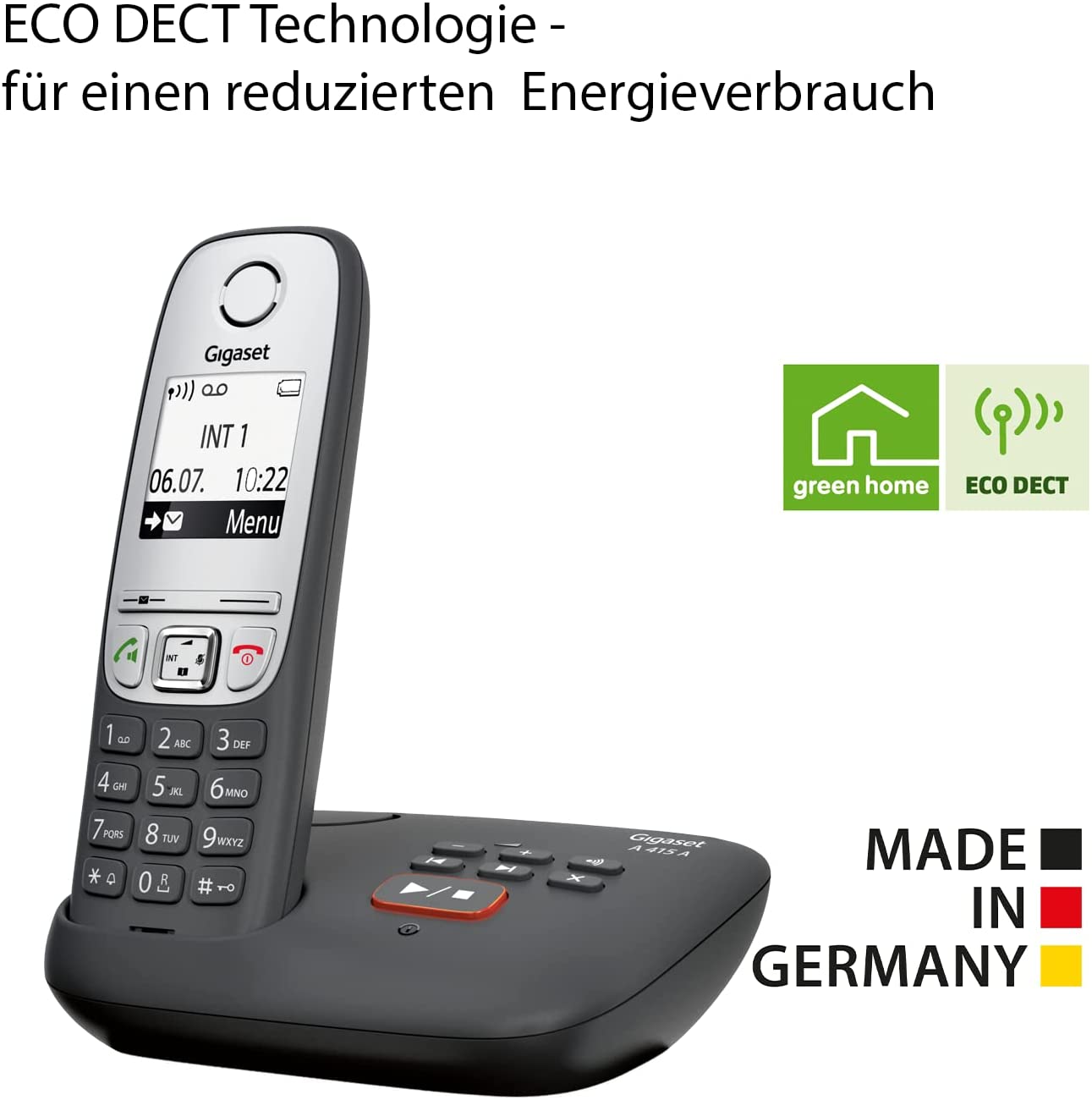 QUALITÄT MADE IN GERMANY: Design und Herstellung in Deutschland – die umweltfreundliche ECO DECT Technologie sorgt für einen reduzierten Energieverbrauch – mit bis zu 200 Std Standby-Betrieb.
